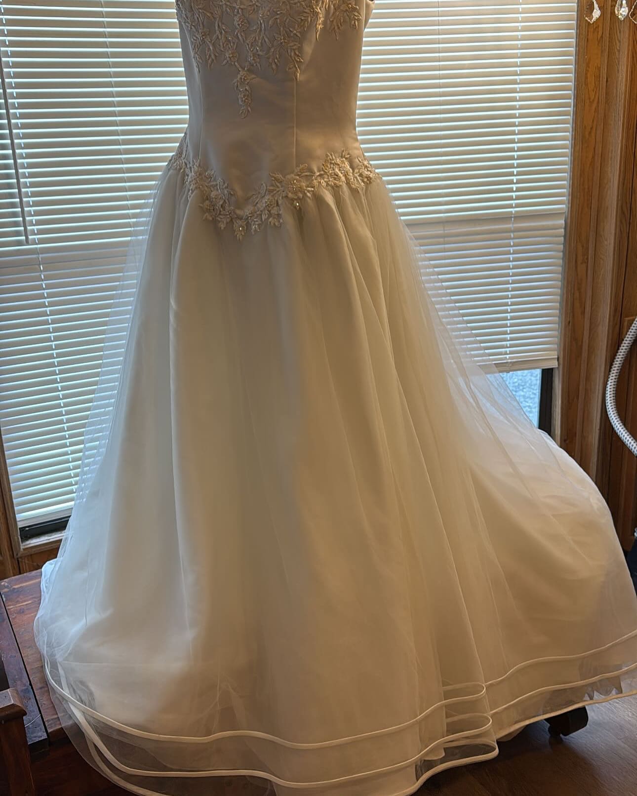 This dress is the perfect dress for a size 14 bride. The basque waist gives a long silhouette. The skirt is floating organza triple trimmed with satin ribbons.